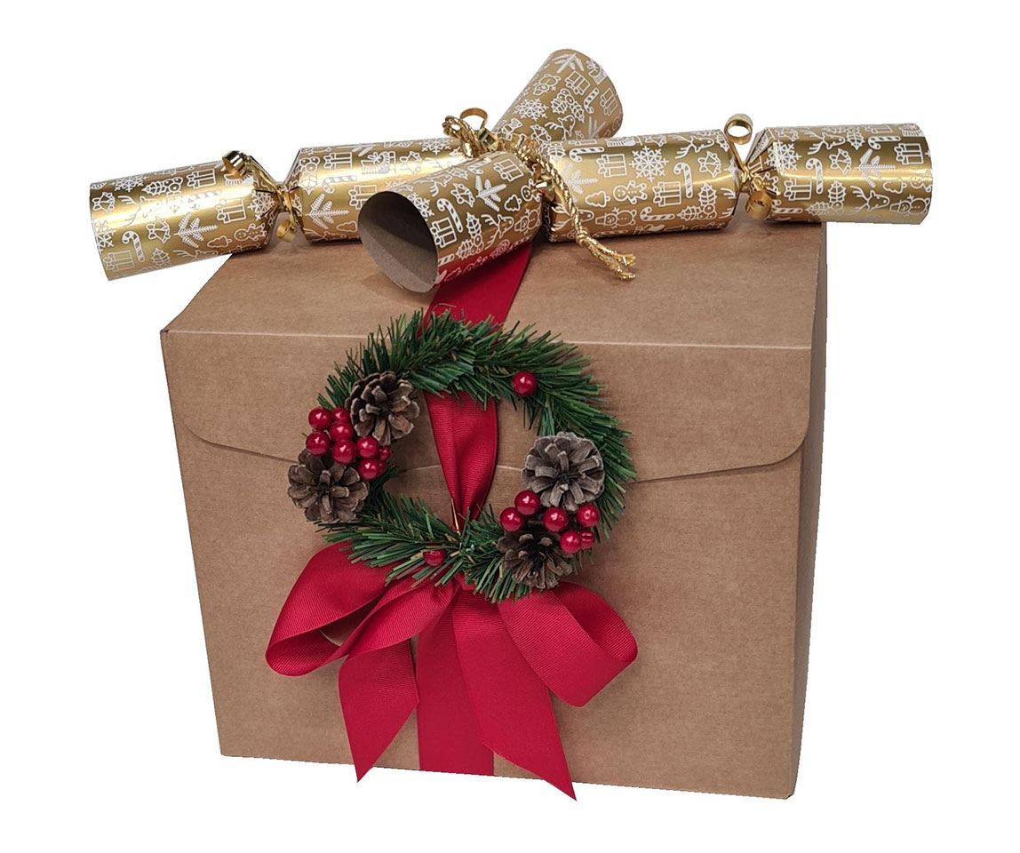 Box trimmed with ribbon and mini spruce, cone and berry embellishment and 2 Christmas crackers