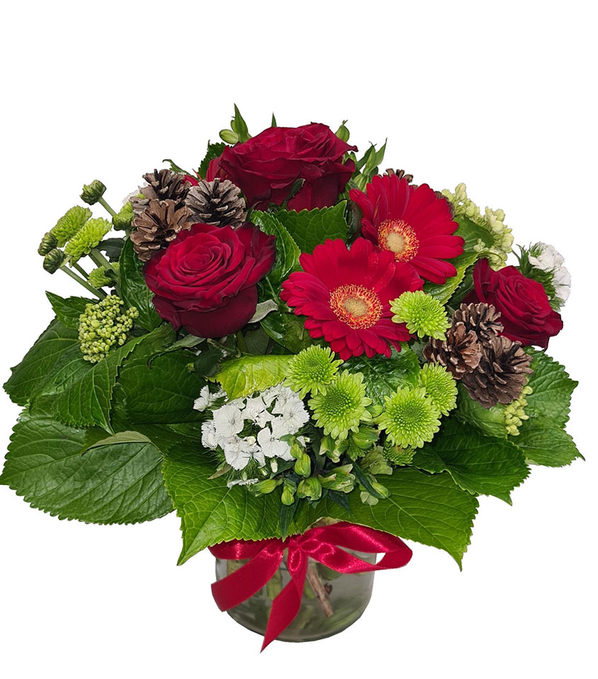 Red,green and white seasonal blooms arranged with lush hydrangea foliage, mini cone detail staged in a glass 10cmW x 17cmH glass cylinder.
