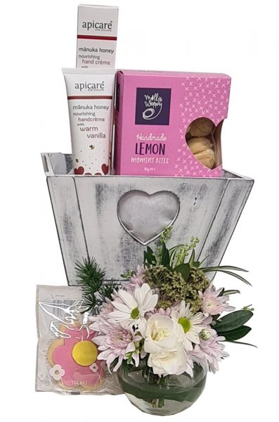 Apicare Manuka honey with warm vanilla nourishing hand crème 90g, Molly Woppy shortbread daisy cookie 58g Lemon moments 165g, and a cute posy of fresh flowers staged in a 9cm mini glass bubble.