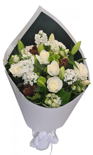 A classical mixed selection of white and green seasonal blooms including lilies arranged with lush hydrangea foliage.